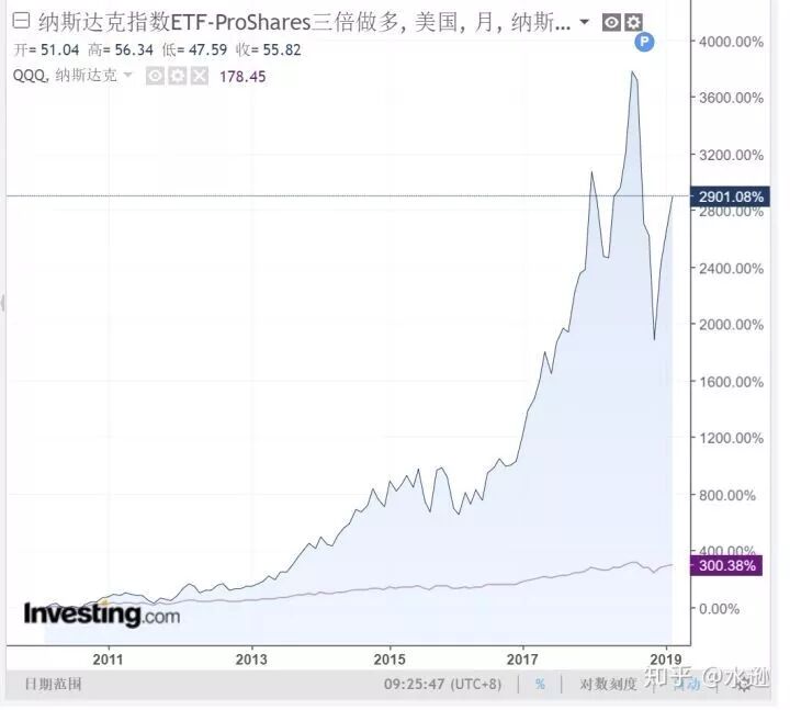 美股就是一个很好的ETF的展示案例。我们都知道美股走了一个十年的牛市,三倍做多的TQQQ收益率是QQQ的10倍之多!
